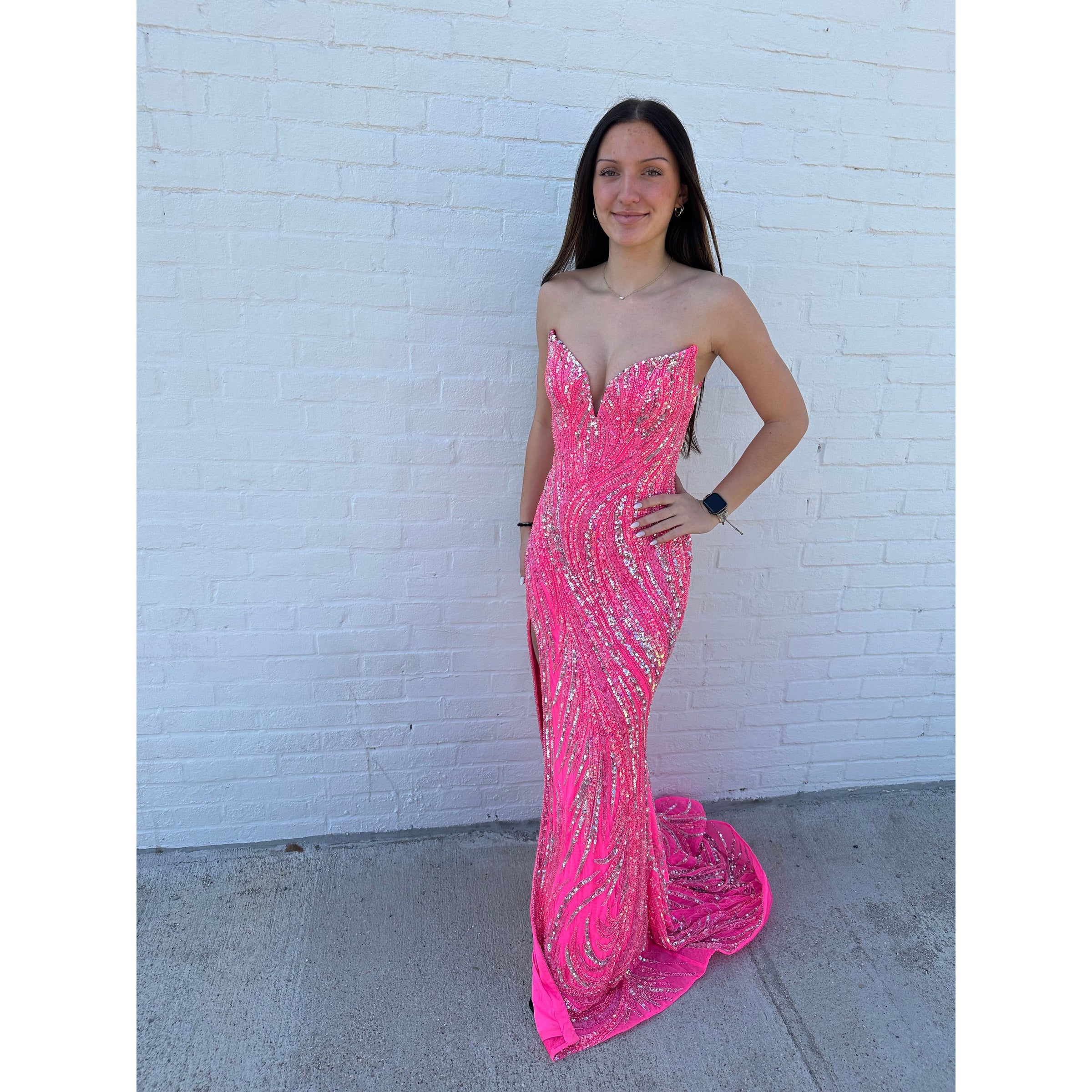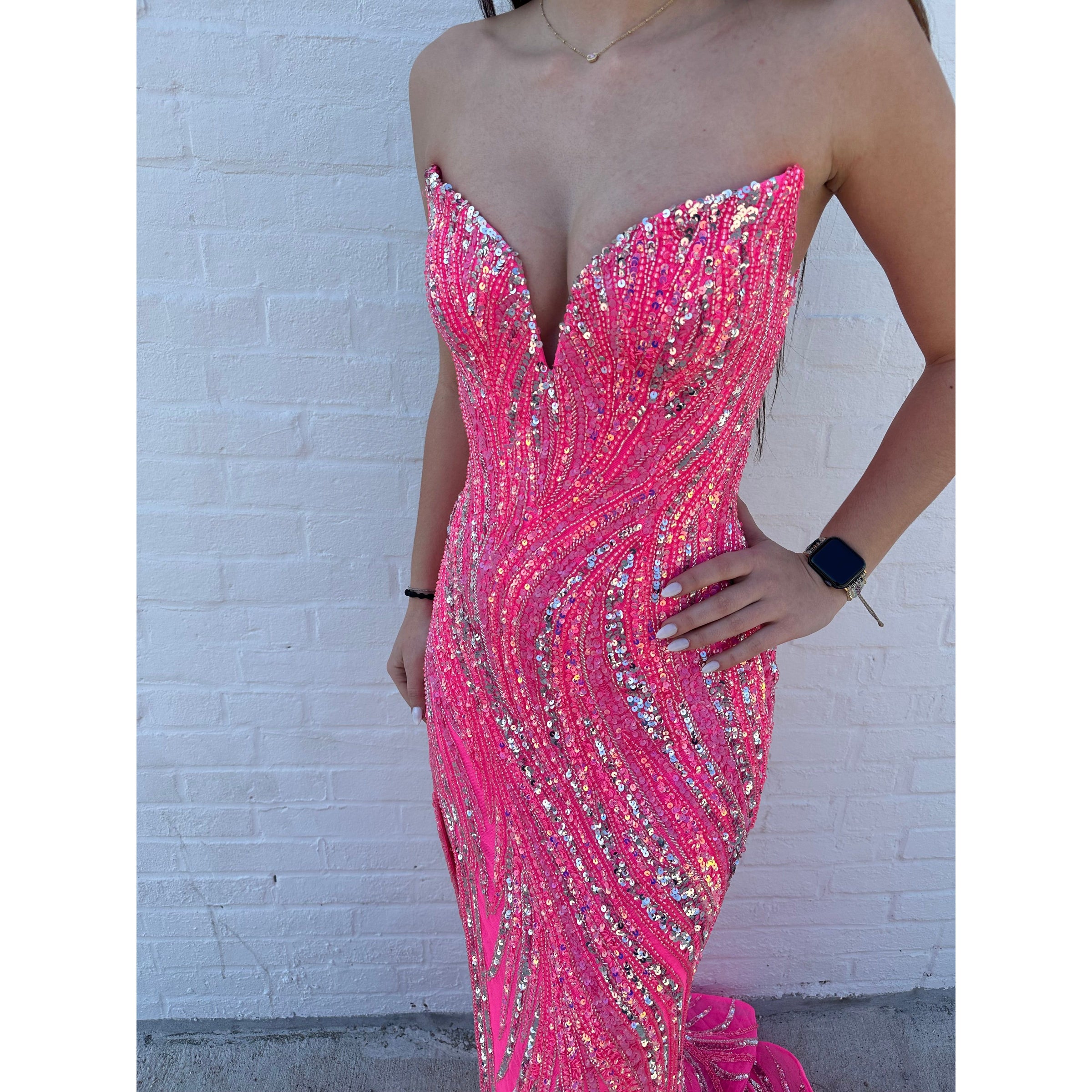 Stun in the strapless sequin prom dress 88291 at your next formal special occasion. Featuring swirls of a dazzling sequined and beaded print, this prom gown sparkles from the low v-neckline to the end of the short train. Hugging the figure through the hips, this tight long prom dress highlights your natural curves. Parting high on the thigh, a side lit makes walking and dancing in this fitted sexy v-neck prom dress a breeze. Make a bold and dramatic entrance to your next formal dance when you wear this strapless long sequin prom dress.