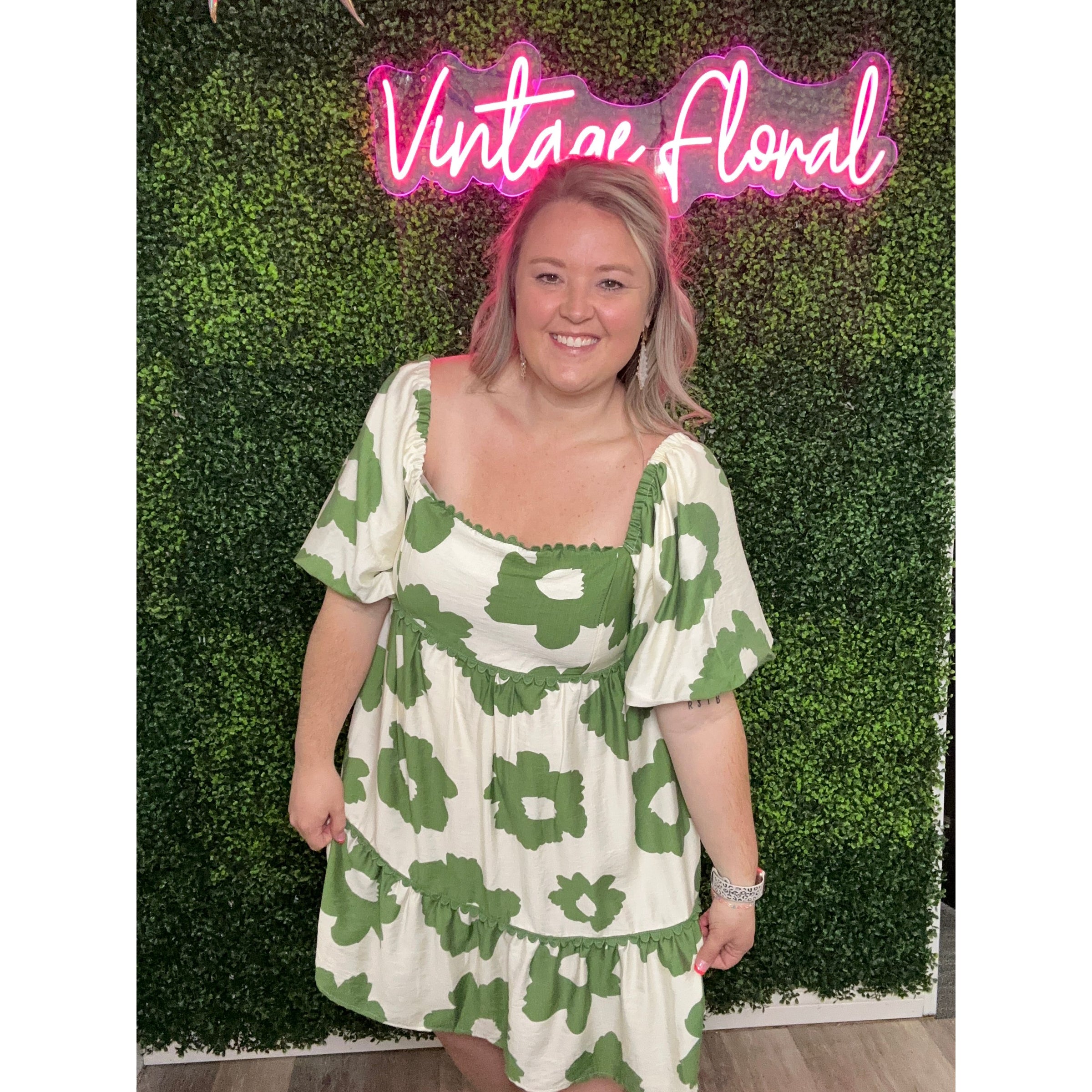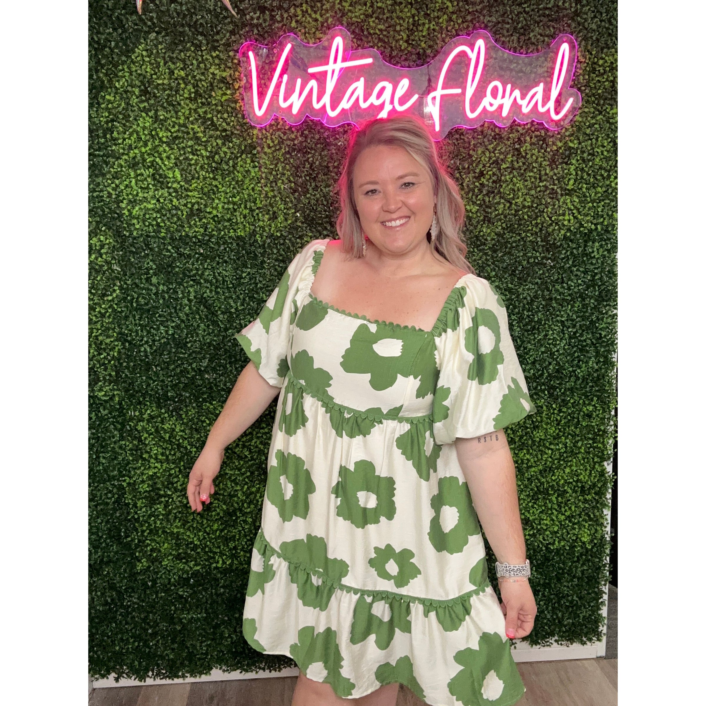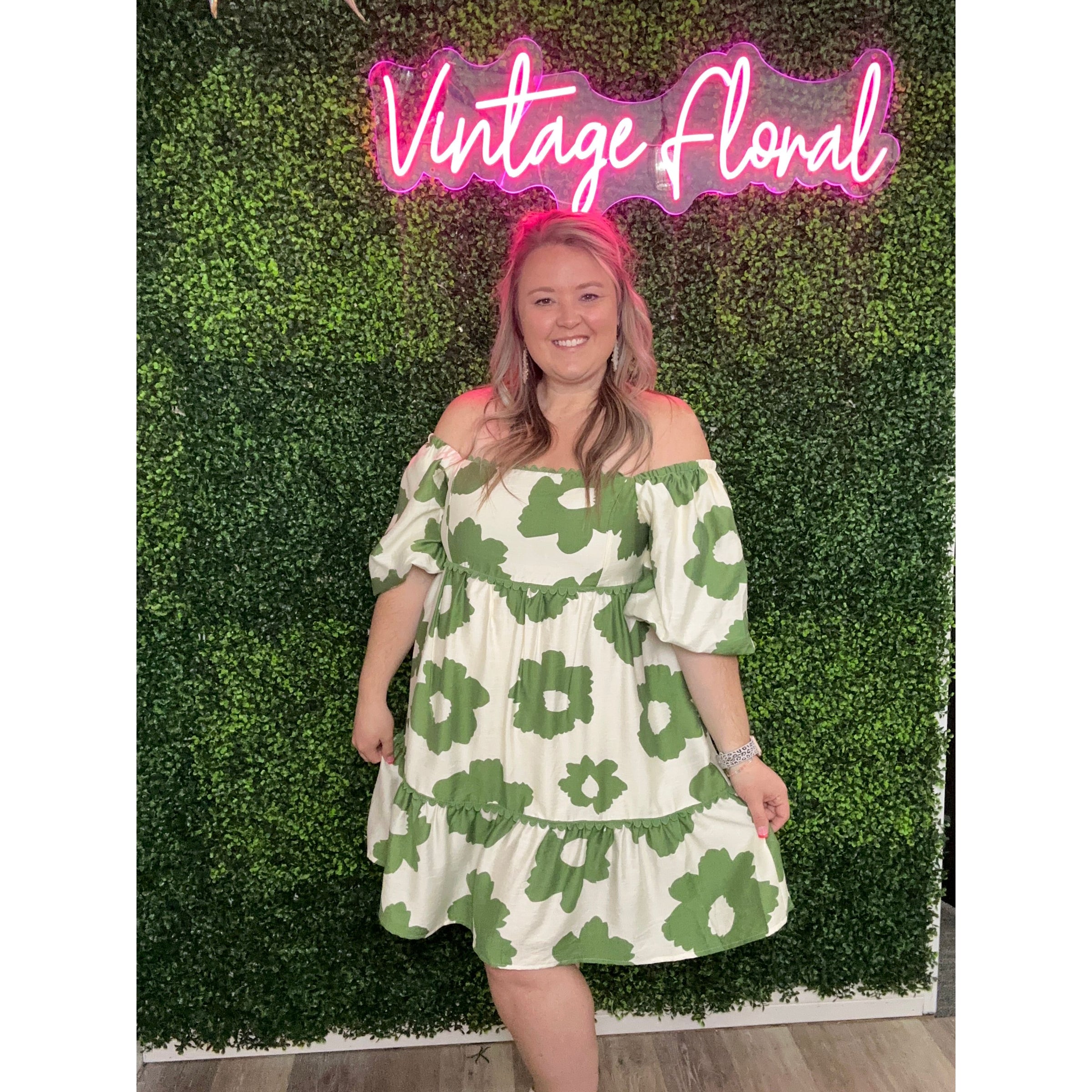 Embrace the whimsical beauty of nature with our Garden of Flowers + Green Dress. This off-the-shoulder mini dress features a delicate flower print, puff sleeves with elastic cuffs, and a tiered babydoll fit. Complete with delicate scalloped trim detailing, this dress is perfect for a playful and fun-loving fashionista.
