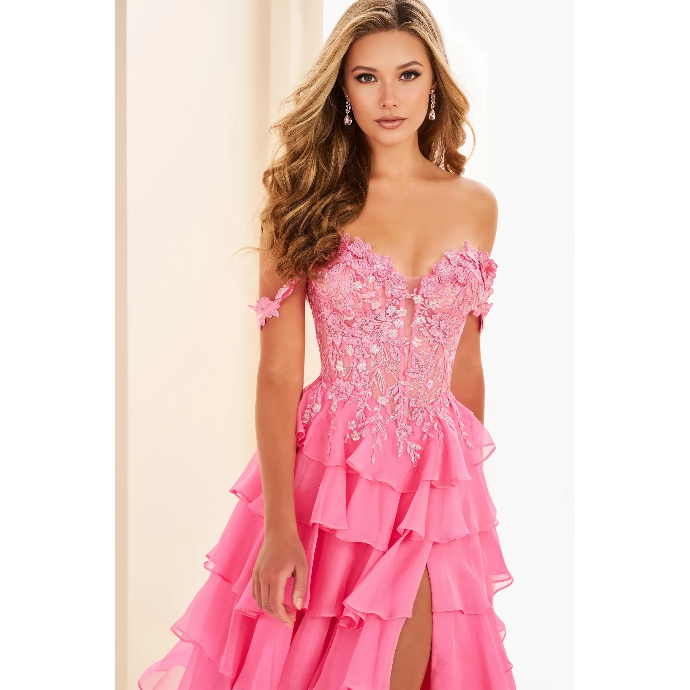 This off-the-shoulder A-line dress is magical. It features a floral lace bodice, a lace-up back, and eight soft layers flowing down the skirt. The off-the-shoulder straps are detachable.