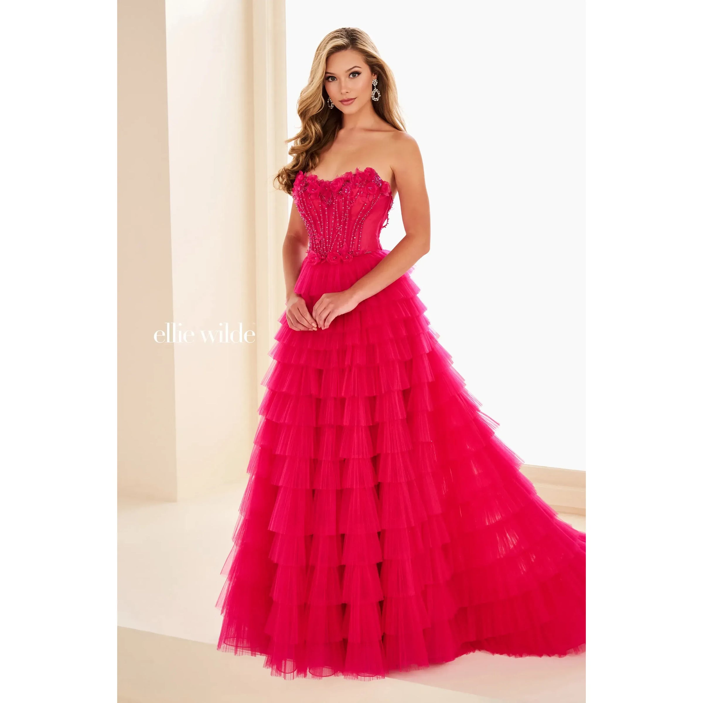 Step into the spotlight with this stunning A-line gown, featuring a semi-sheer corset bodice adorned with delicate beading and three-dimensional organza flowers. The 14-tiered ruffle skirt adds playful volume and movement, perfect for dancing the night away. Separate tulle spaghetti straps included.
