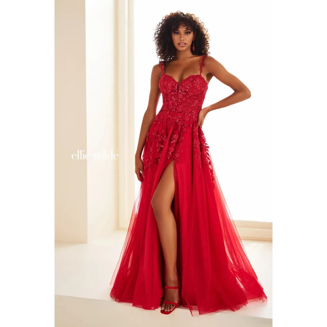 EW36046 is an A-line gown that combines timeless elegance with modern flair. Featuring a sweetheart neckline, corset bodice adorned with intricate lace appliqués and shimmering stone accents, this dress hugs your curves beautifully. The glitter tulle skirt flows gracefully, while the side slit adds a touch of drama. Perfect for prom or any special occasion, this gown is designed to make you feel confident and radiant.