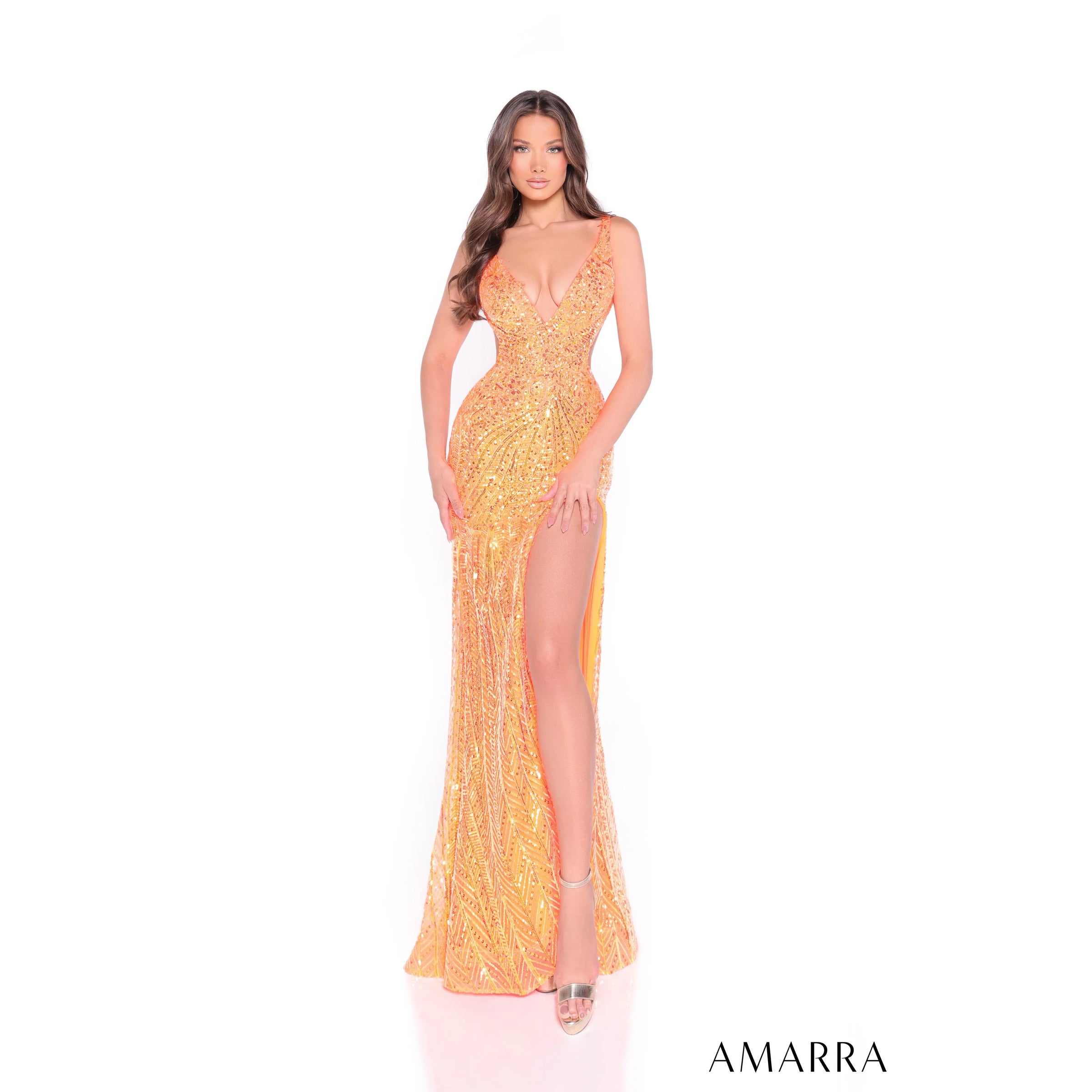 Stand out in the Amarra deep v-neck sequin prom gown with open back style 89293. The fully beaded and sequined surface creates a dazzling sparkle that commands attention. Sparkling sequins catch the light with every step, creating a luminous glow that moves with you. A deep V-neckline creates a dramatic, eye-catching opening that adds allure and confidence. The full-length design gives you a commanding presence that moves gracefully with you. The open back adds a dramatic reveal that turns heads with every turn. Designed as a standout sequin prom dress, this gown pairs elegance with body-flattering details. You feel confident standing, sitting, or dancing because the fit stays smooth and secure. Captivate from entrance to exit at your next special occasion in this v-neck formal gown.