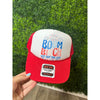 Celebrate the 4th of July with attitude wearing the BOOM .. Get Out the Way Trucker Hat in a bold red and white combo. This playful hat packs a punch with its sassy message and classic trucker style, perfect for standing out at any summer gathering. The breathable mesh back keeps you cool while you make your way through the festivities. Show off your fiery spirit and let everyone know you mean business with this fun, festive accessory.