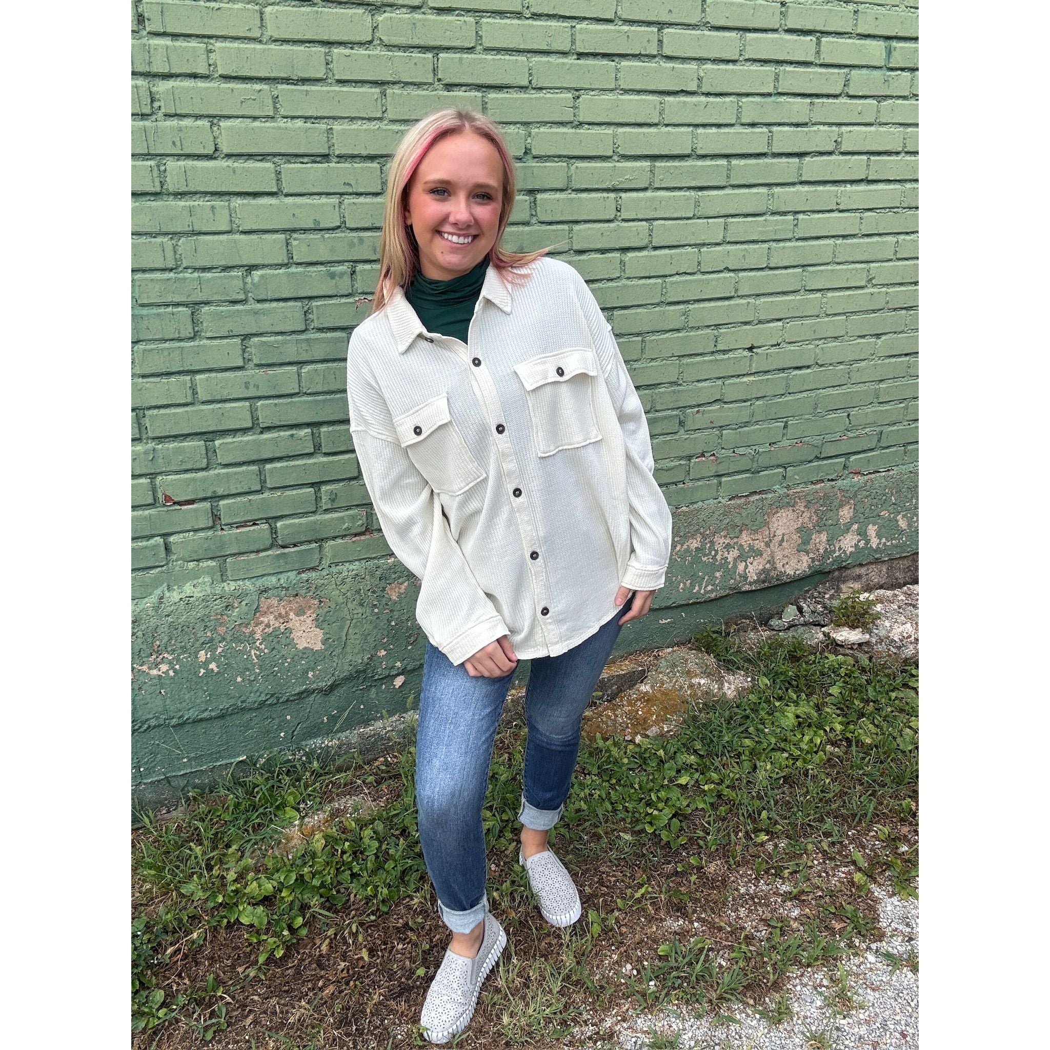 This mineral-washed oversized waffle knit shacket bringse a trndy, laid-back vibe with its roomy fit. The oversized design makes it perfect for easy layering, whether you're heading out or keeping it casual. Style over a tee with jeans for an effortlessly cool look.