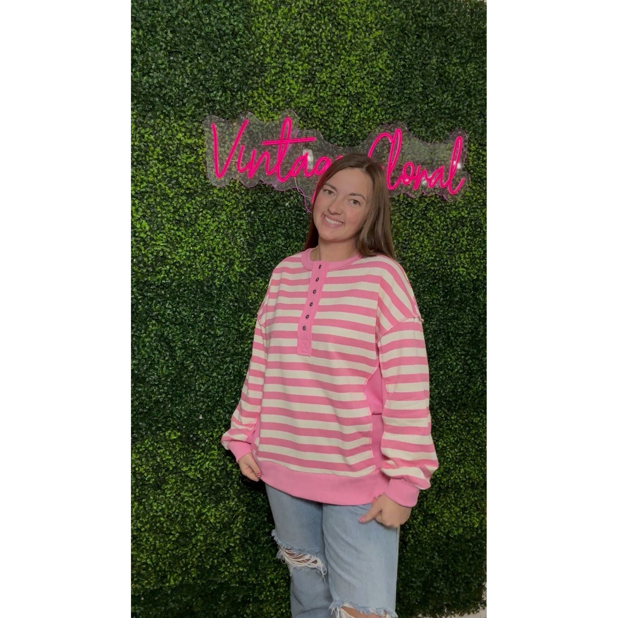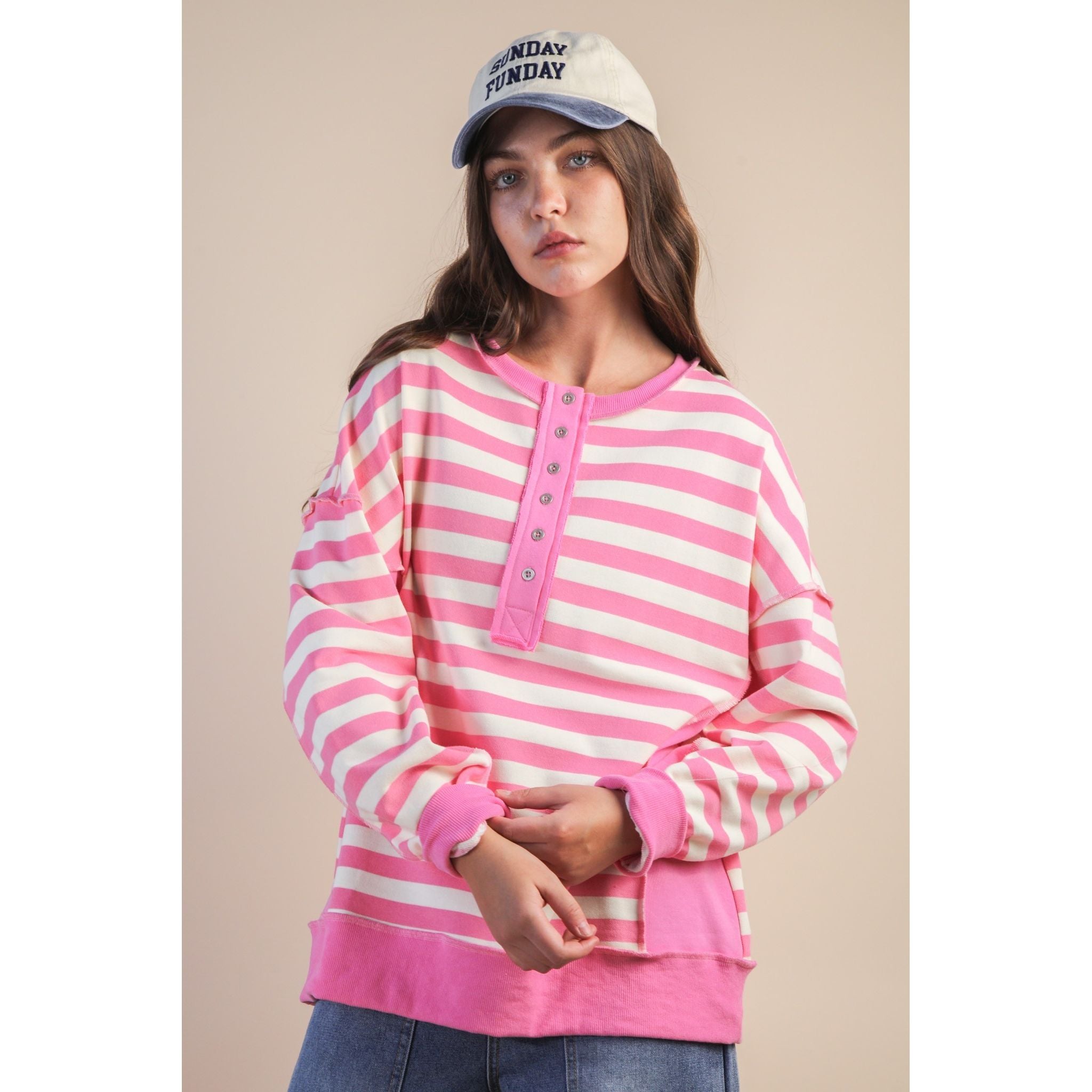 Effortlessly chic meets cozy comfort in this oversized striped knit top! The soft pink and cream stripes create a timeless look that pairs beautifully with everything in your closet. Half button-down styling gives you the perfect amount of casual flair—button it up for a polished vibe or leave it open for laid-back weekend vibes. The relaxed fit is ideal for layering or wearing solo, making it your new go-to piece for spring strolls, coffee dates, or just feeling fabulous doing absolutely nothing.