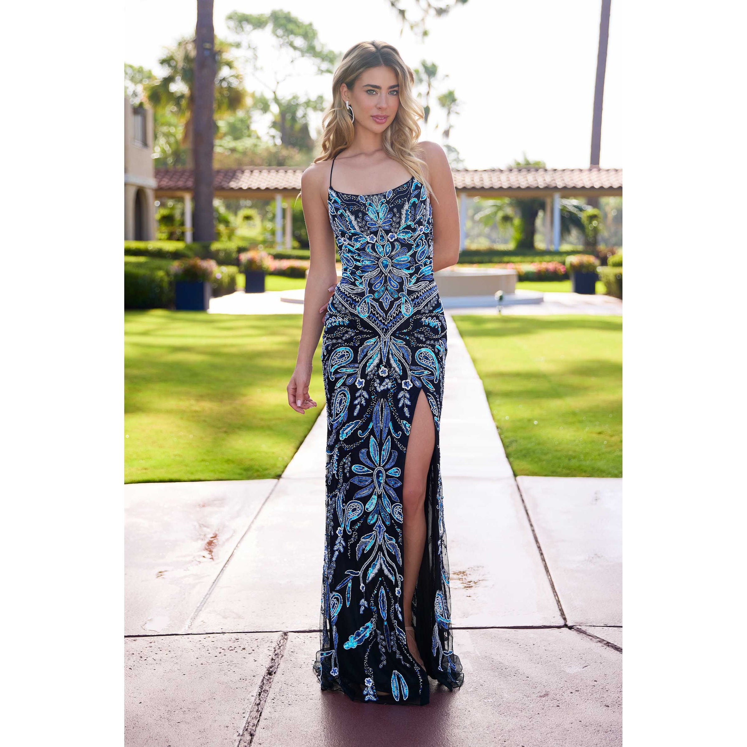 Beaded gown with pearl accents, scoop neckline, fitted silhouette, and side slit; elegant, shimmering, and effortlessly glamorous.