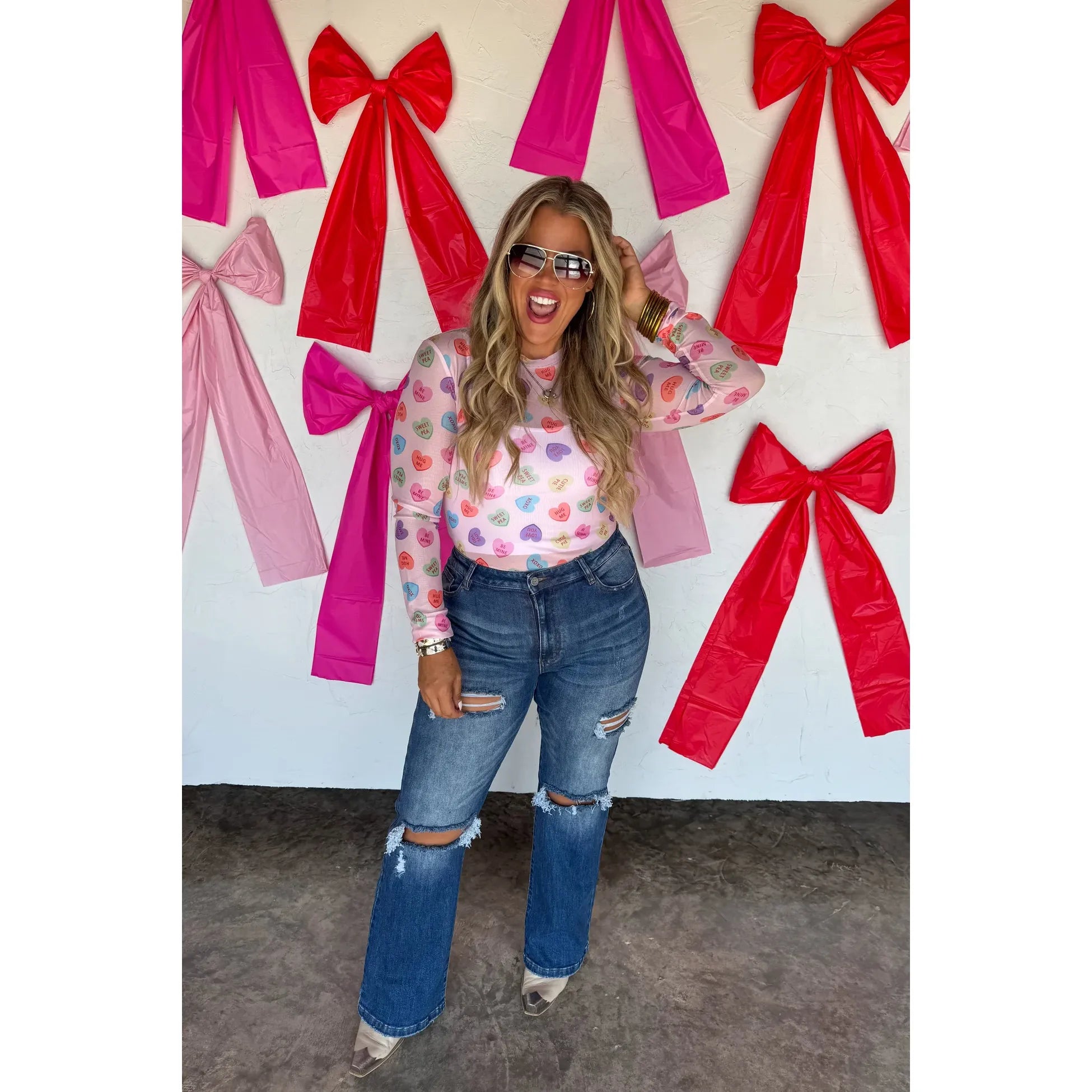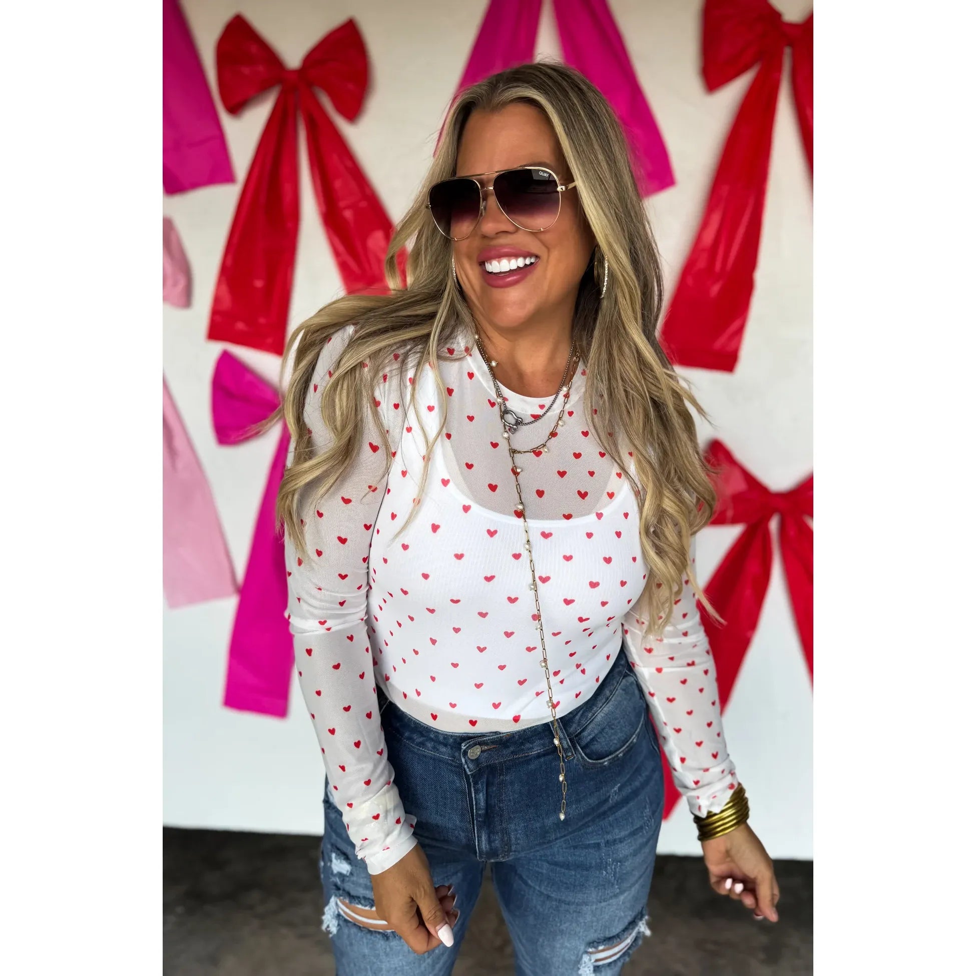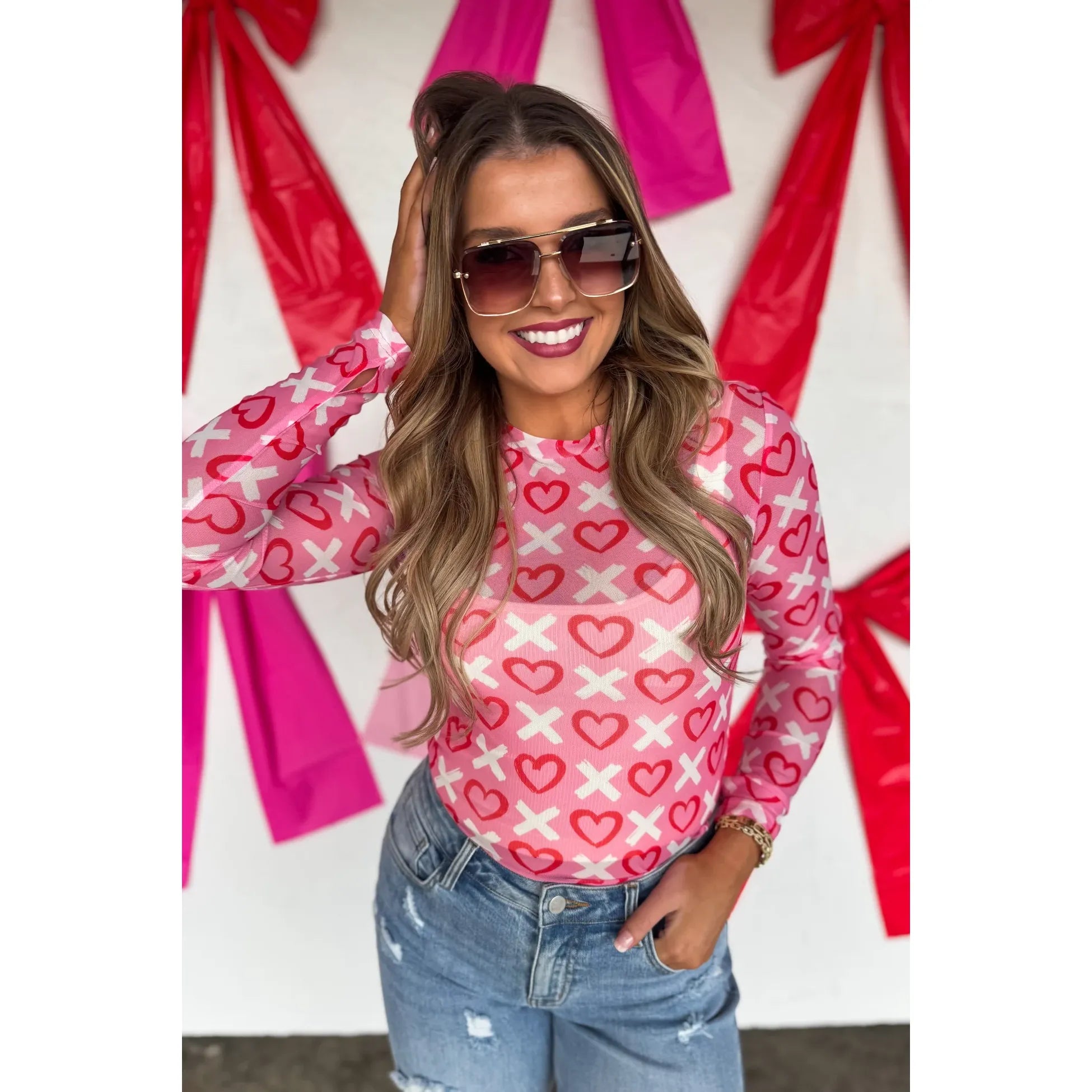 OUR VALENTINES PRINTS ARE HERE!! Super cute for layering, this sultry stretchy mesh print long-sleeve top features a totally sheer design. Perfect worn alone or paired under your favorite cardigan, vest or sweater! Crew neck and thumbhole details.