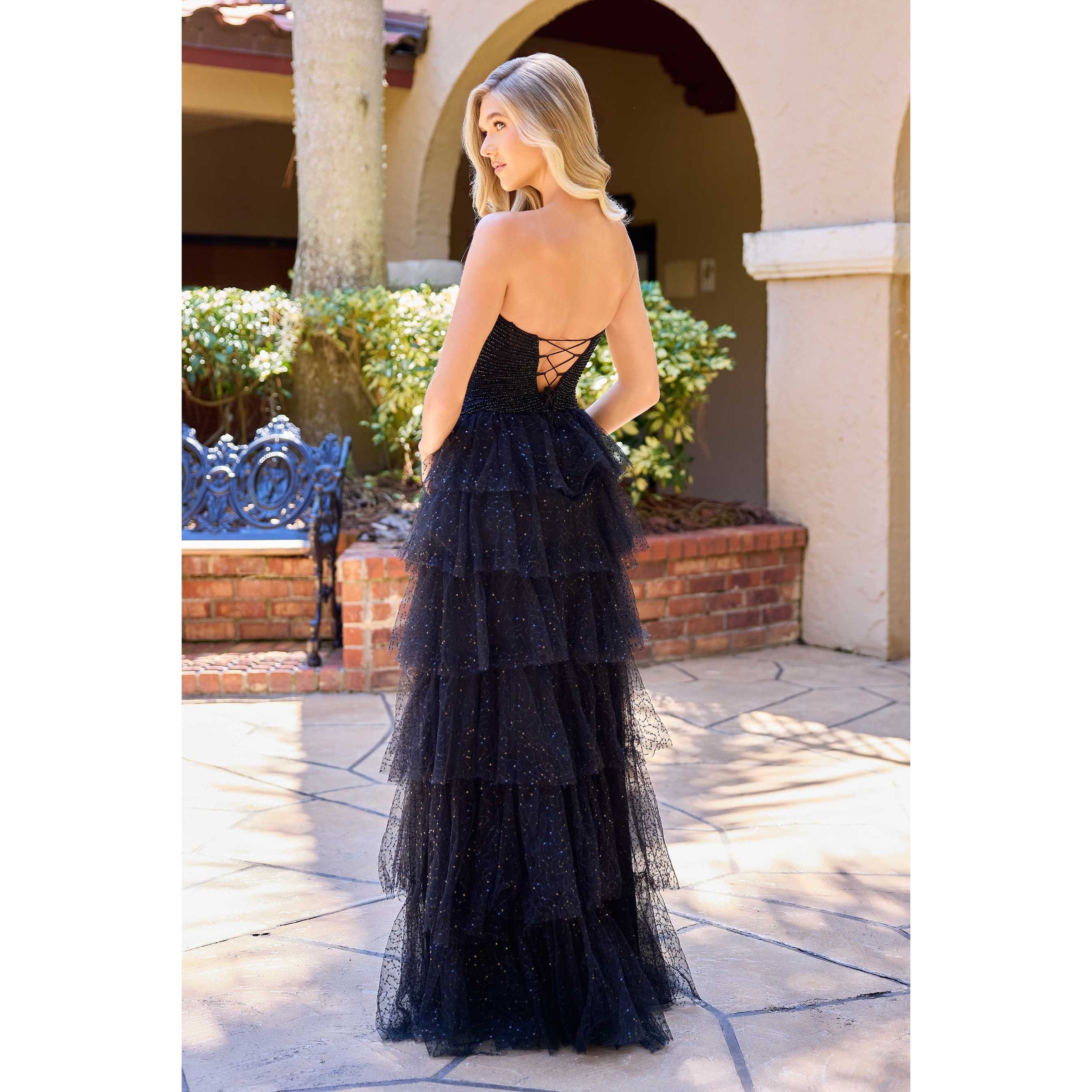 Strapless with double keyhole cutouts, tiered tulle skirt, lace up back, and high slit; chic, playful, and elegant.