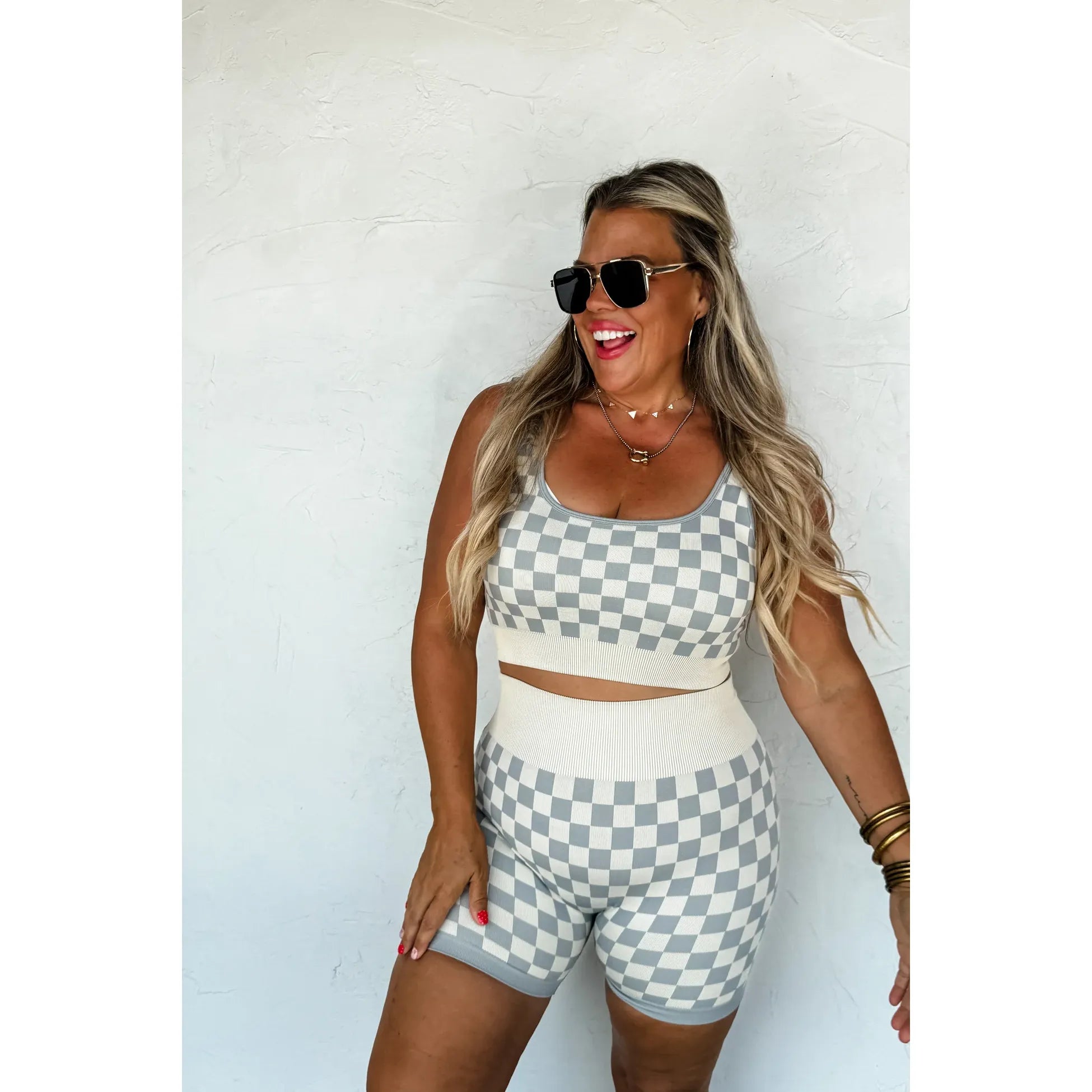 This matching set features a seamless scoop back and front bra and high-waisted biker shorts with a bold checker pattern and ultra-stretchy, sculpting two tone, knit/rib fabric. Designed for both comfort and style, the set offers a supportive fit that moves with you, whether you’re hitting the gym or running errands, this set is perfection!.
