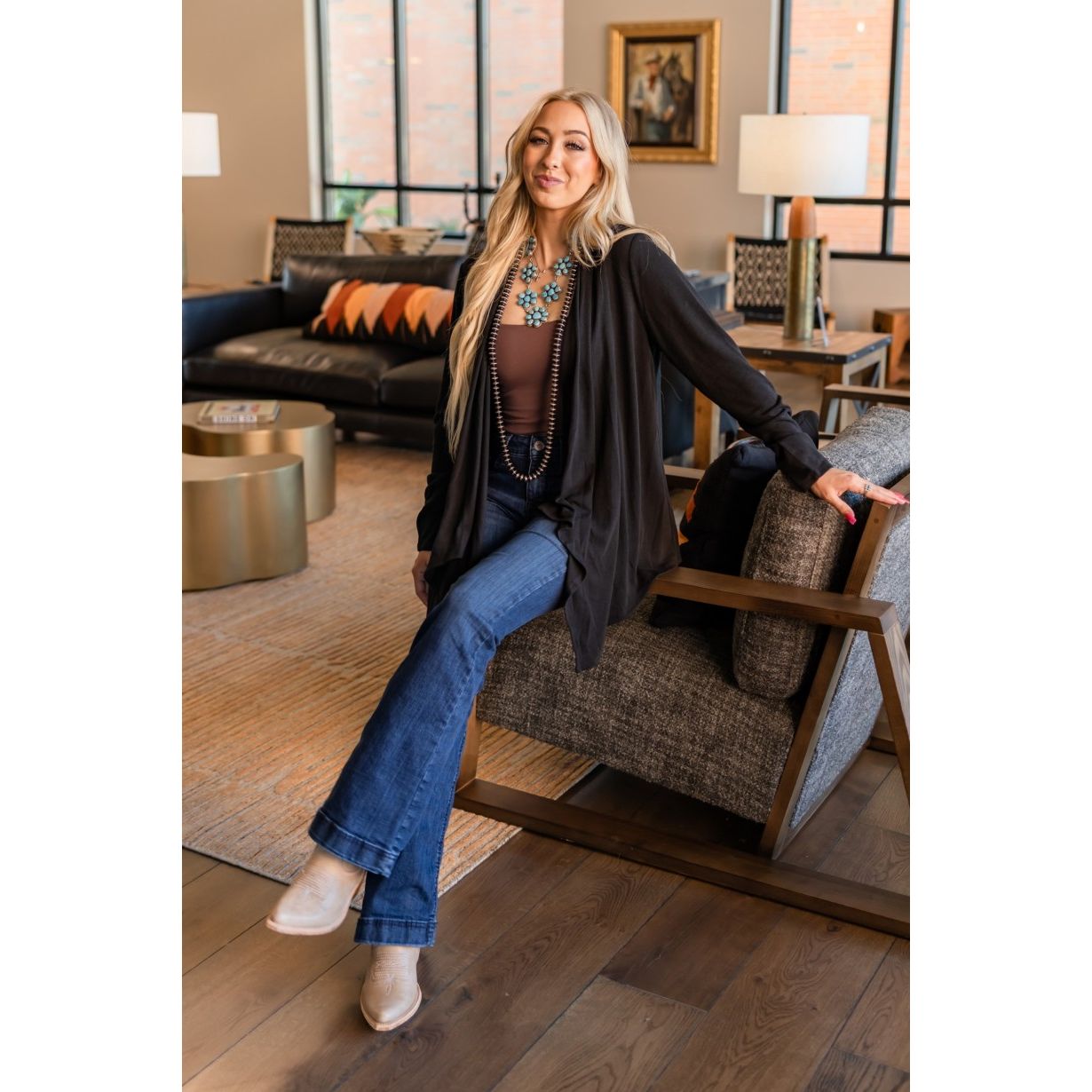 Wrap yourself in effortless elegance with this waterfall-style open front cardigan. Crafted from lightweight hacci knit, this cardigan features a drape that moves beautifully with you. The cascading front adds a touch of sophistication, while the fabric is so soft.