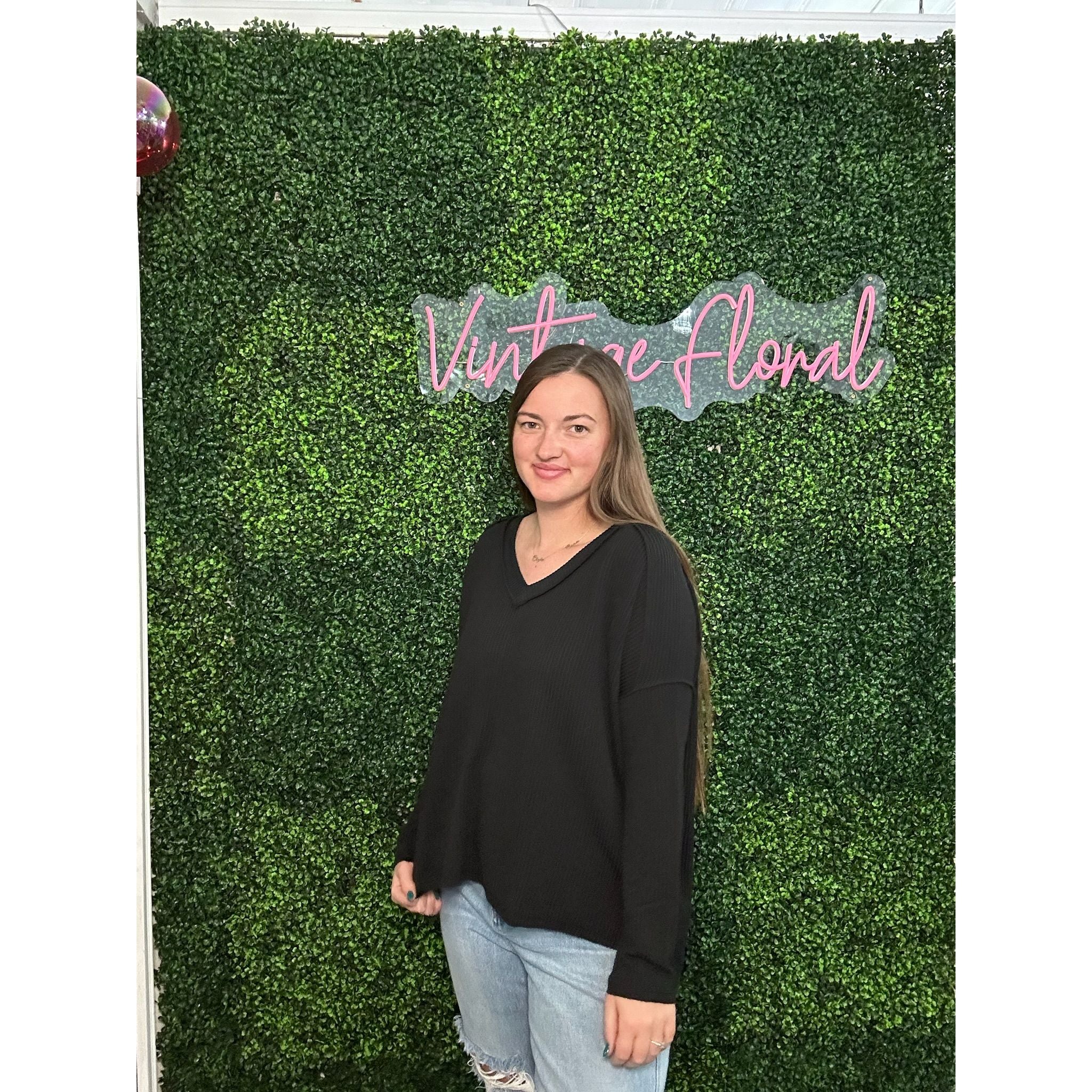 BLK SAT. - Raised Rib Long Sleeve V-Neck Top