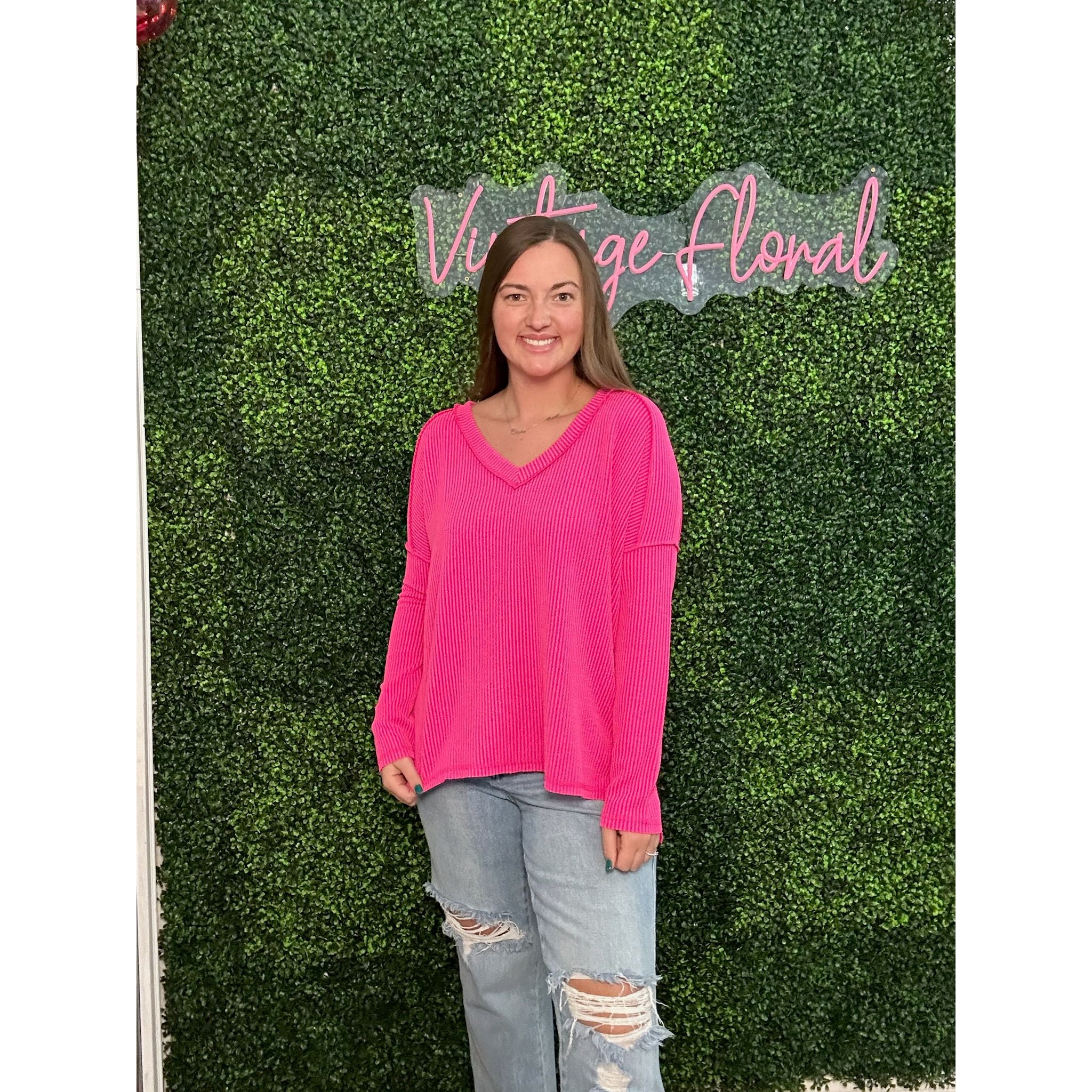RAISED RIB LONG SLEEVE HI-LOW V NECK TOP