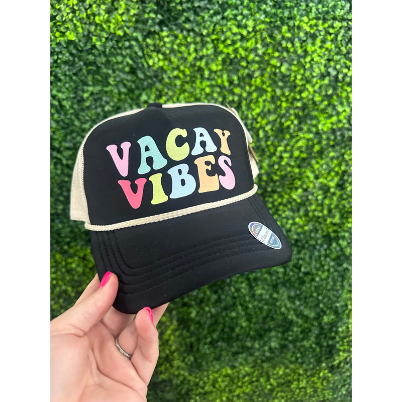 Get ready to add some colorful vacay vibes to your wardrobe with our Colorful Vacay Vibes + Black Hat! This trucker hat features a bold and vibrant design on a sleek black hat. Perfect for adding a pop of fun to any outfit, while also keeping you cool and shaded on your adventures. (Vacay-ready and sun-ready in one stylish package.)