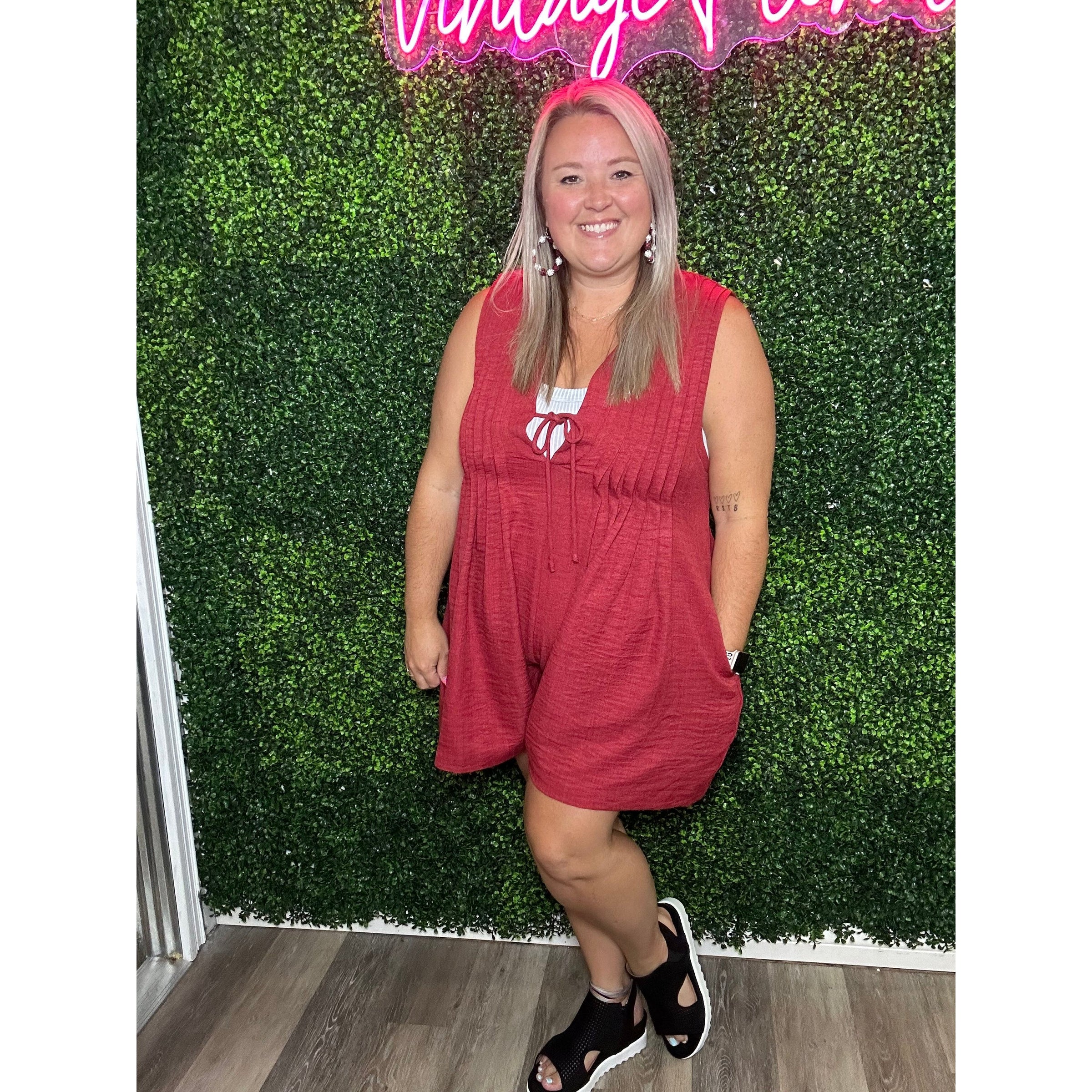 Dive into effortless style with the Emmy Tie Front + Romper! This sleeveless overall romper features a deep V and pleated details, offering a loose, breezy fit with handy pockets. Made from a lightweight linen-look polyester, it’s perfect for layering and has a convenient zipper in the back for easy wear.