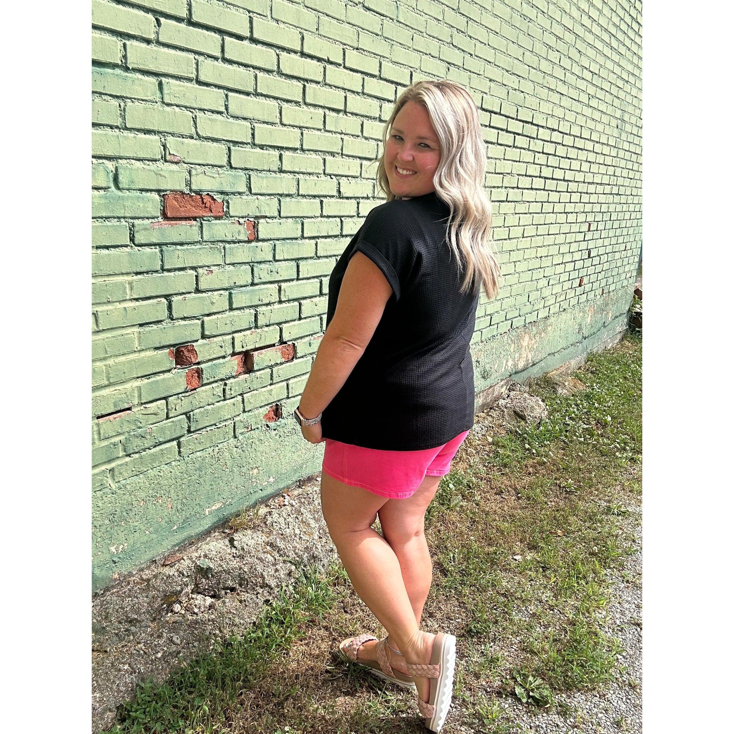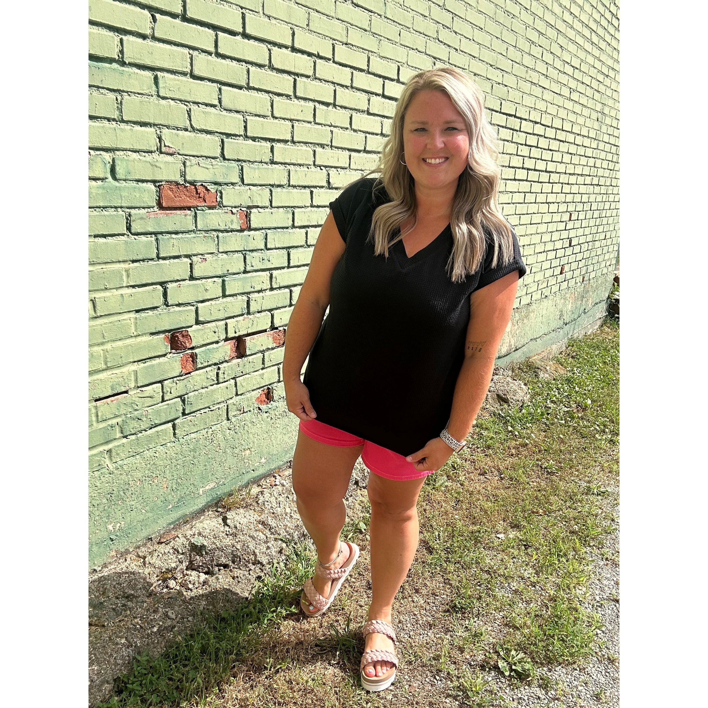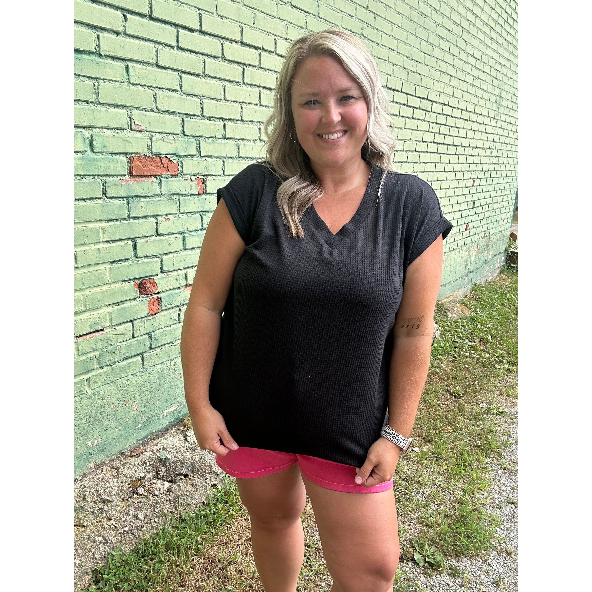 Stay comfortable and stylish in this two tone thermal top, designed with a flattering v-neckline and short dolman sleeves for a relaxed, effortless look. It's classic, easy, and a versatile piece that's perfect for layering. Stretchy, knit.
