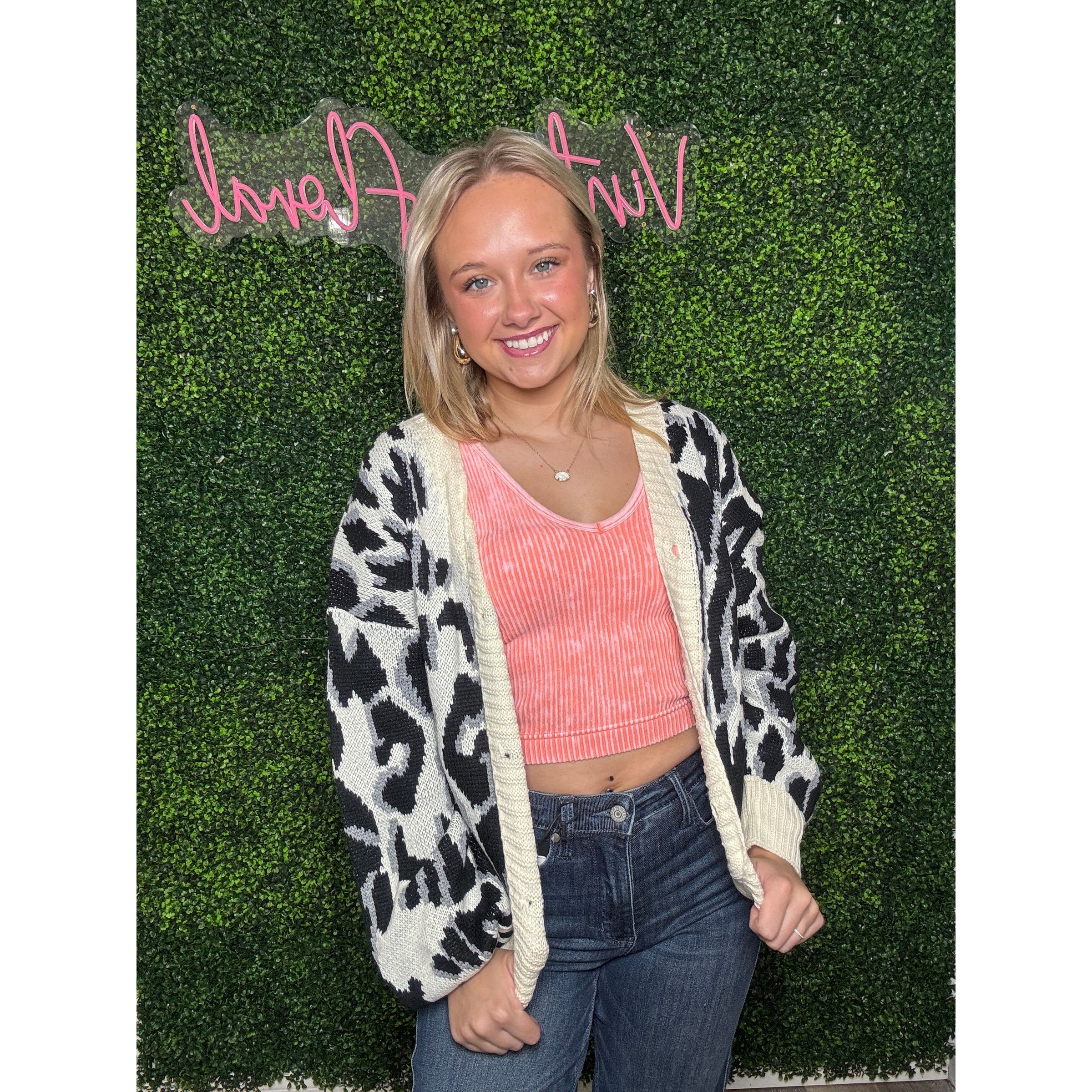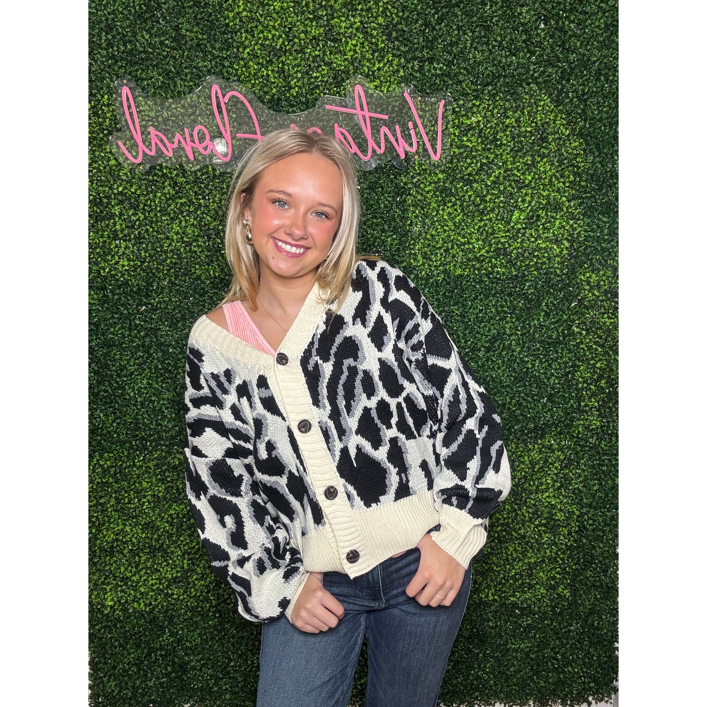 Embrace your wild side with this playful animal print button-down cardigan in creamy tones. Cozy yet chic, it effortlessly layers over your favorite outfits, adding a dash of fun and flair. Perfect for days when you want to feel a little bold and a lot comfy.