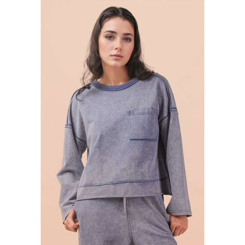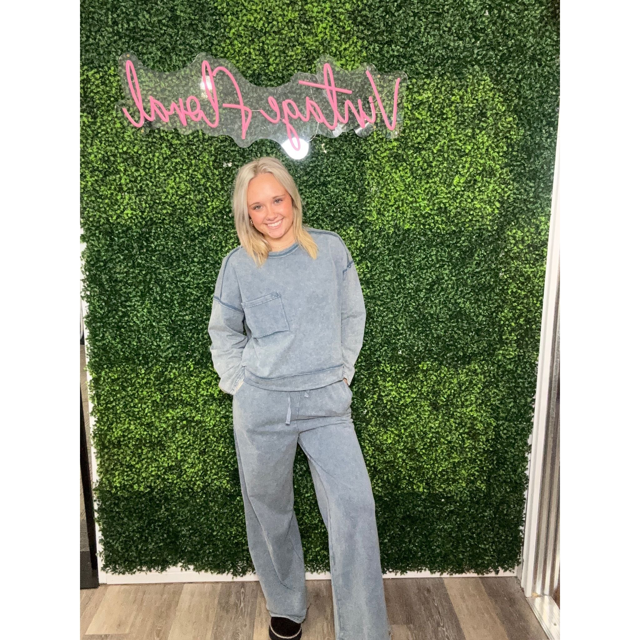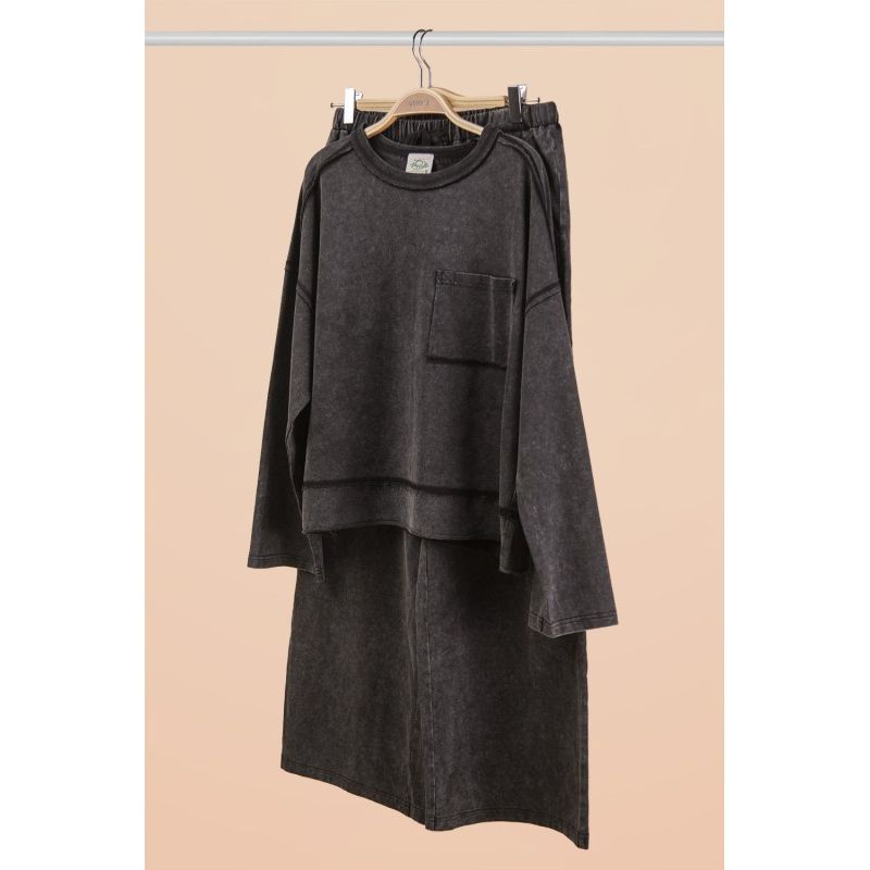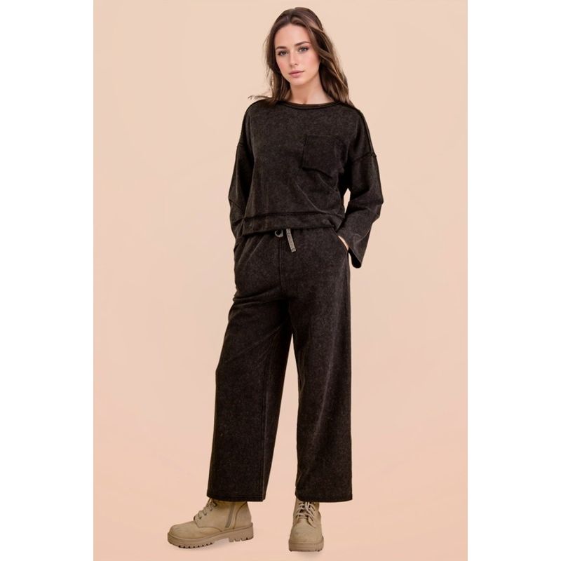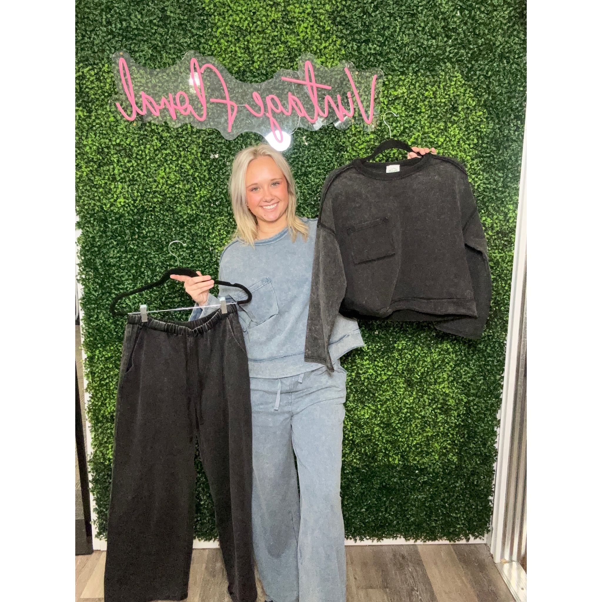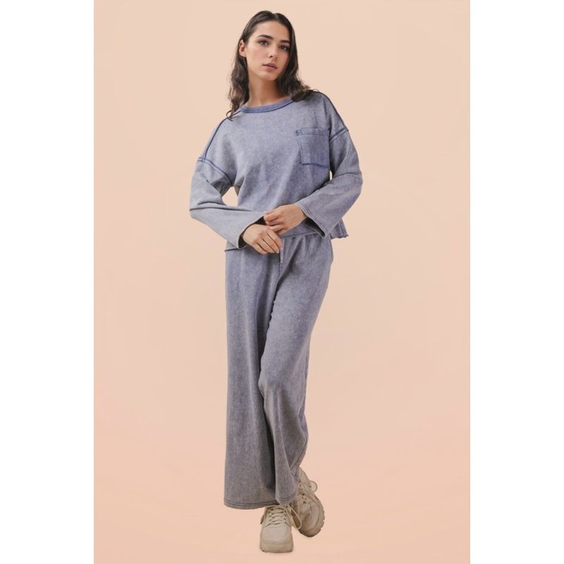 Mineral Washed Casual Knit Top & Pants Set - Loungewear TOP - Oversized - Drop Shoulder - Patch Pocket - Long Sleeve BOTTOM - Elastic Waist W/ Drawstring - Side Pockets - Wide Leg (Model height: 5"9", wearing a Small, 2-2-2 Size Ratio, NEW IN)