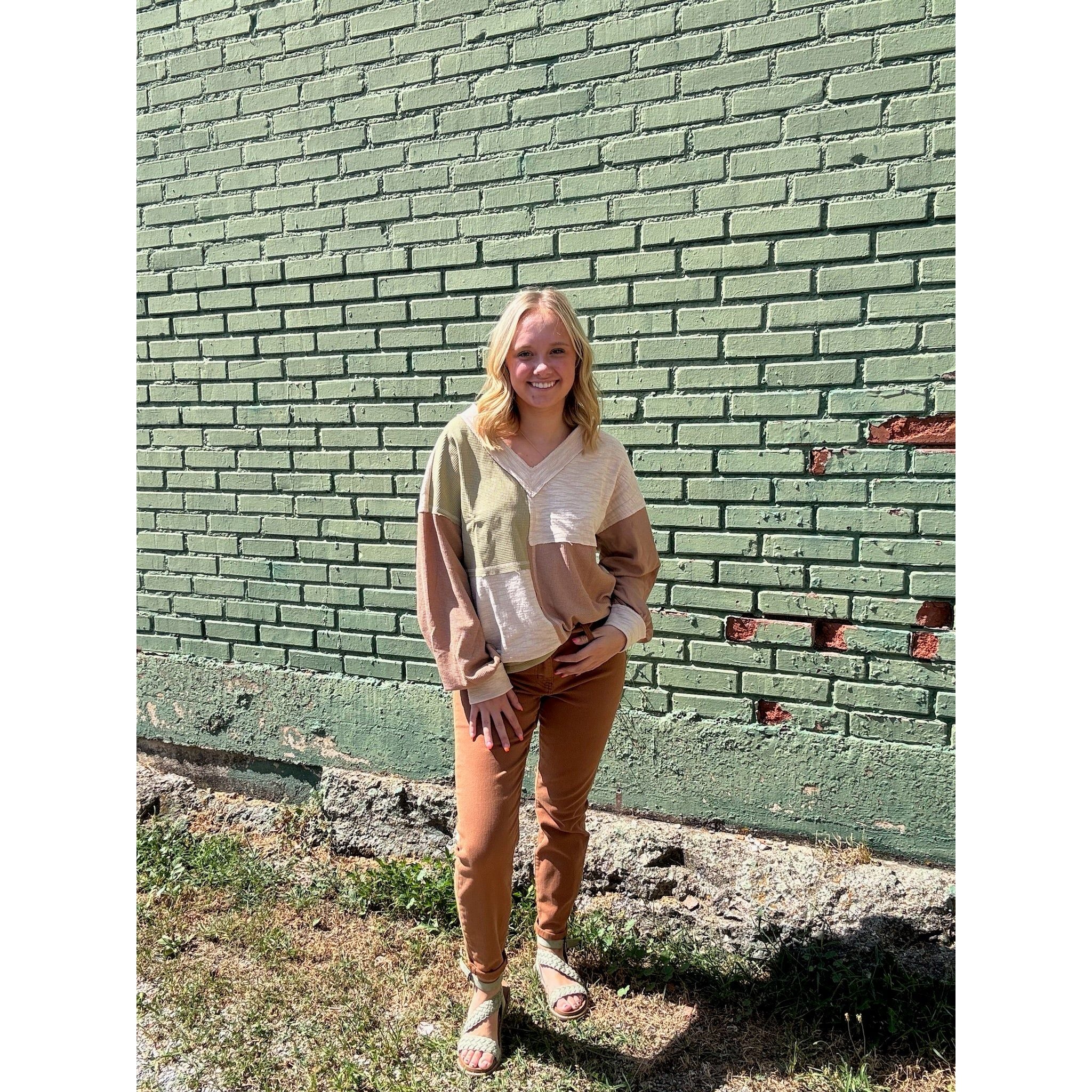 Embrace cozy vibes with this Mocha Color Block Long Sleeve Top. Featuring a relaxed oversized fit, playful drop shoulders, and a flattering V-neck, it’s perfect for laid-back days. The raw edge details add just the right touch of edge to your casual look. Easy to layer or wear solo, this knit top brings fun and comfort together effortlessly.