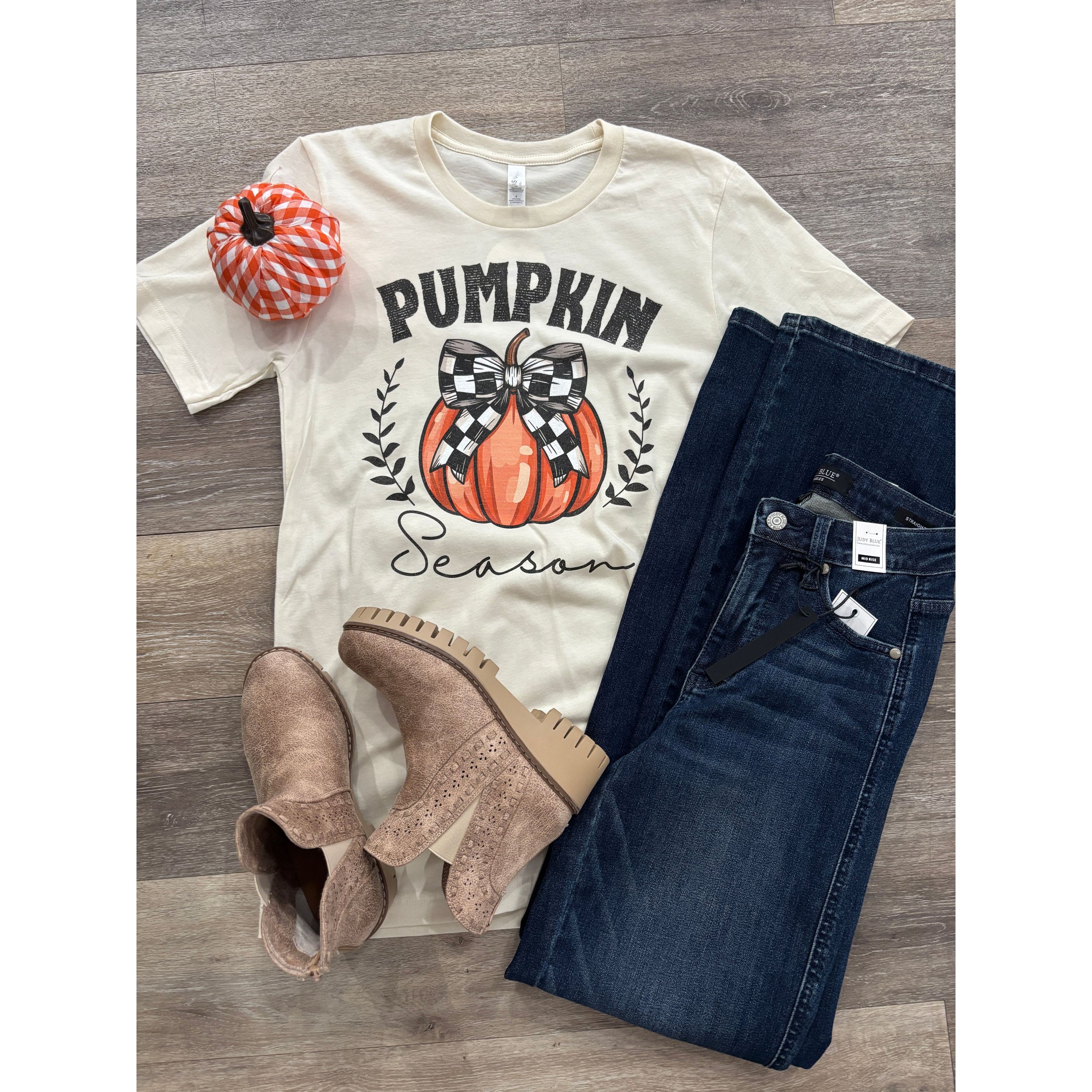 Celebrate sweater weather in style with this Bella Canvas graphic cream tee featuring a playful "Pumpkin Spice Season" saying. The charming checkered print bow adds a cozy, autumnal touch, making it perfect for pumpkin patch visits or cozy coffee dates. Soft and comfortable, this tee brings fall vibes to your casual wardrobe with a fun twist.