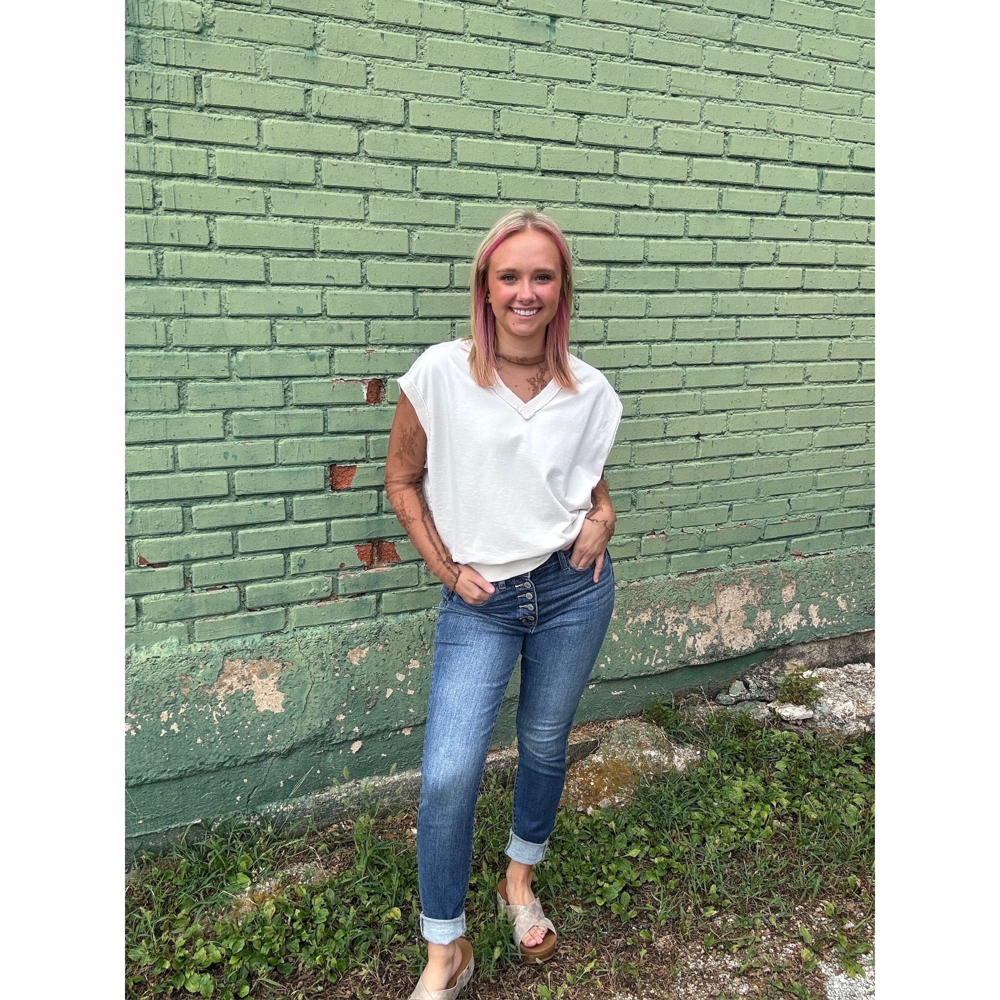 Elevate your everyday style with this playful sleeveless vest featuring a flattering V-neckline and a banded waist for a cozy fit. Seam detailing along the neckline, shoulders, and armholes adds subtle charm. Perfect for layering over a long-sleeve tee and pairing with jeans for a fun, casual look that’s effortlessly cool.