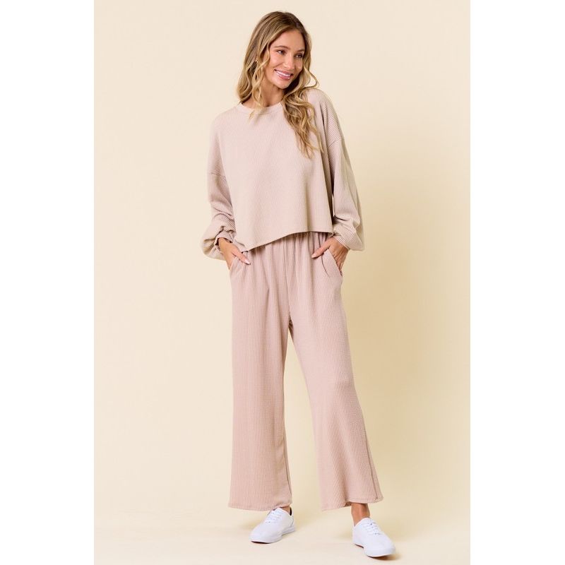 Get cozy and stylish with the Take Me Back + Taupe Ribbed Set. Made from soft ribbed fabric, this playful set includes ankle-length straight-leg pants featuring an elastic waistband and two front pockets for easy comfort. The long-sleeve top with a round neckline pairs perfectly for a laid-back look—wear together or mix and match for endless cozy vibes.