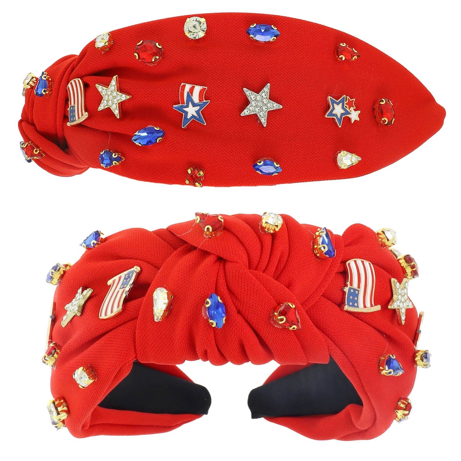 AMERICAN FLAG THEME SEW-ON ENAMEL CHARM CRYSTAL EMBELLISHED TOP KNOTTED HEADBAND HEIGHT: 6.5" WIDTH: 2.5" PATRIOT STYLE FREEDOM LOOK STAR ACCENT RED WHITE AND BLUE DETAIL SPARKLE FLAG PIECE FESTIVE GEAR